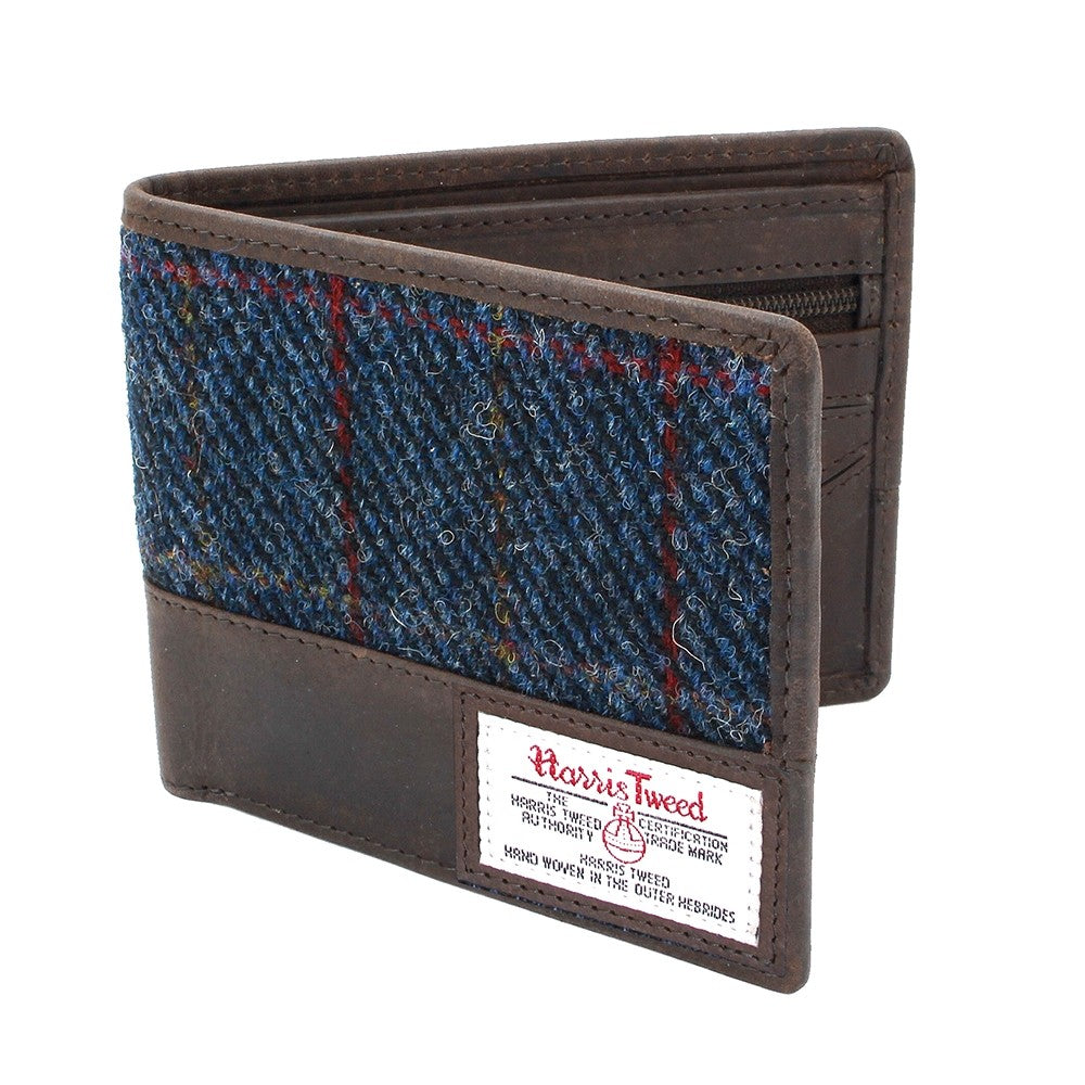 The Allasdale Wallet featuring Harris Tweed pattern, complemented by dark brown leather and hues of navy, red and blue.