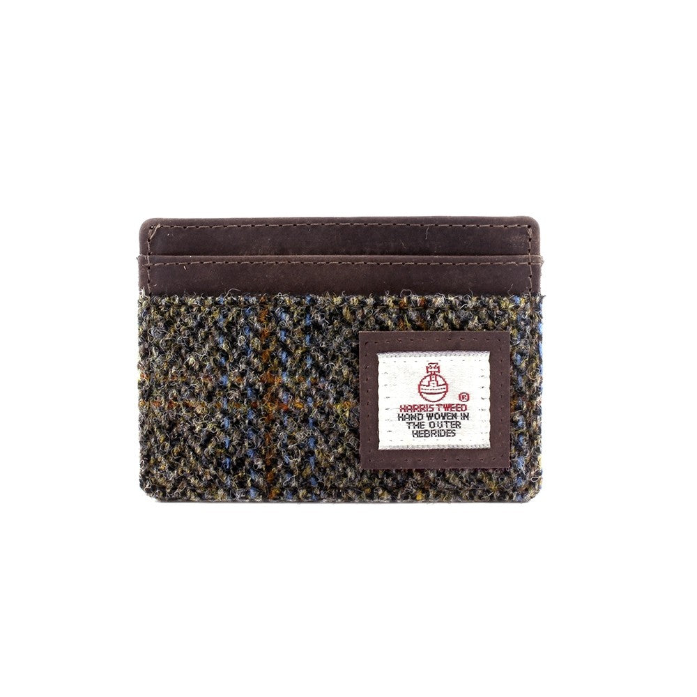 Brown, Tan & Blue Tartan Credit Card Holder featuring Harris Tweed pattern with leather trim