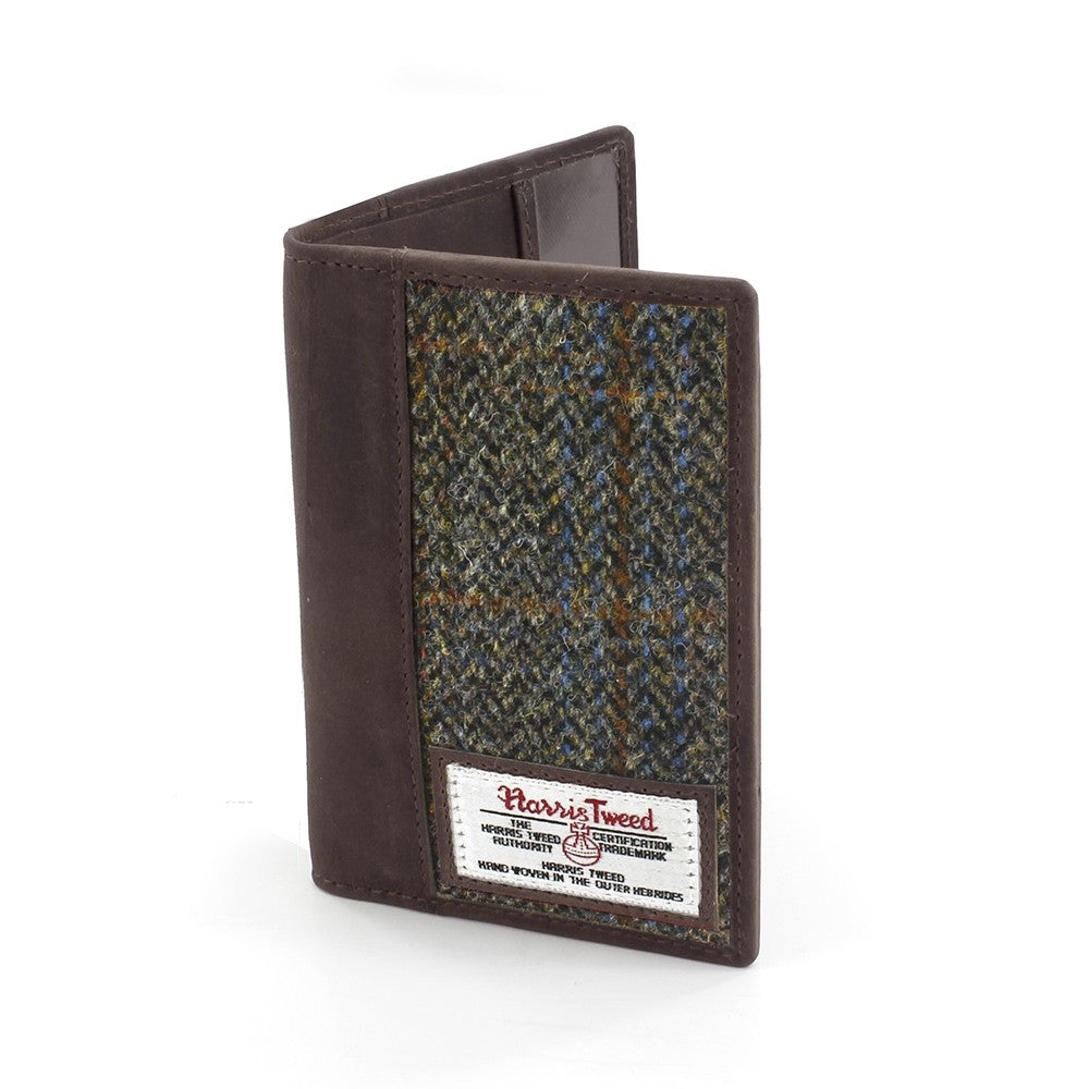 Harris Tweed Pattern incorporating tans and browns with a hint of blue. Complemented by a dark reddish brown leather.