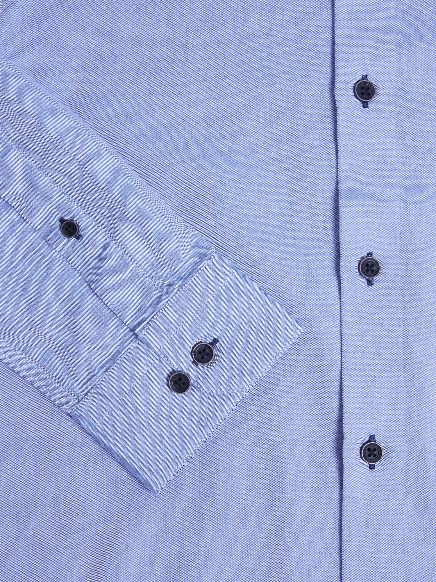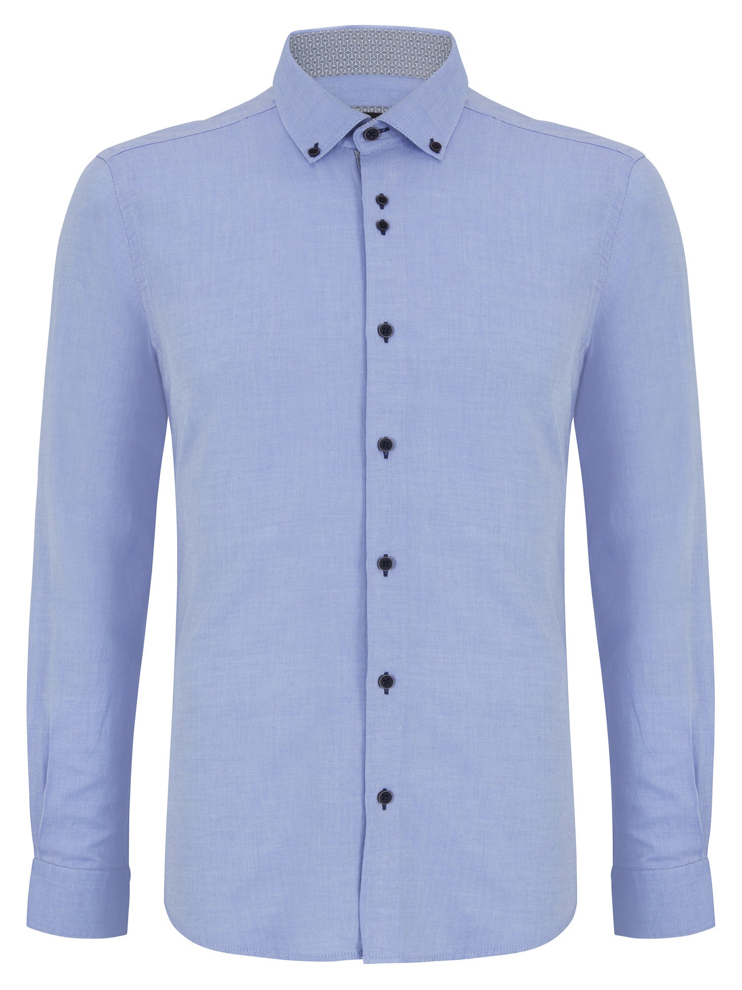 Contrast trim on front placket, cuff and collar linings